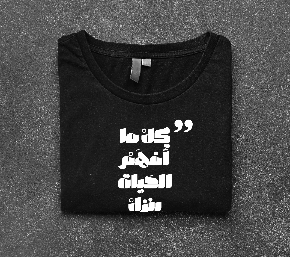 Minimal Arabic typography T-shirt with the phrase “Every time I understand life, it gets a new update.” A bold and modern design for deep thinkers with a sense of humor.