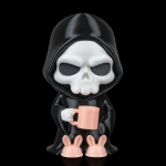 A spooky-cute Grim Reaper with a coffee mug and bunny slippers. Perfect as a keychain or display figurine for Halloween lovers and coffee addicts alike.